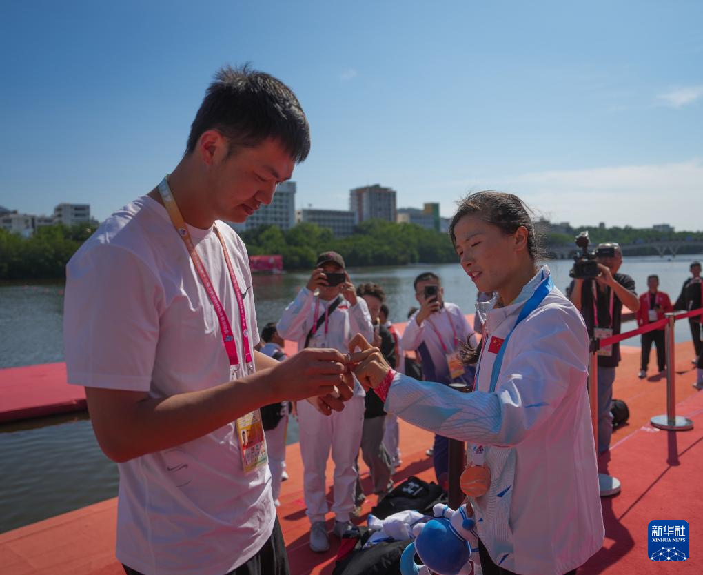 在28日的獨竹漂女子組200米直道賽中,海南代表團選手何國潤在“一葦渡江”的驚險後又經曆了驚喜,獲得該項目三等獎的她在頒獎儀(yi) 式後被男友浪漫求婚。在現場的參賽選手、媒體(ti) 記者和觀眾(zhong) 的見證下,這對情侶(lv) 相擁而吻,這一刻,波光粼粼的三亞(ya) 河化身為(wei) 愛河。