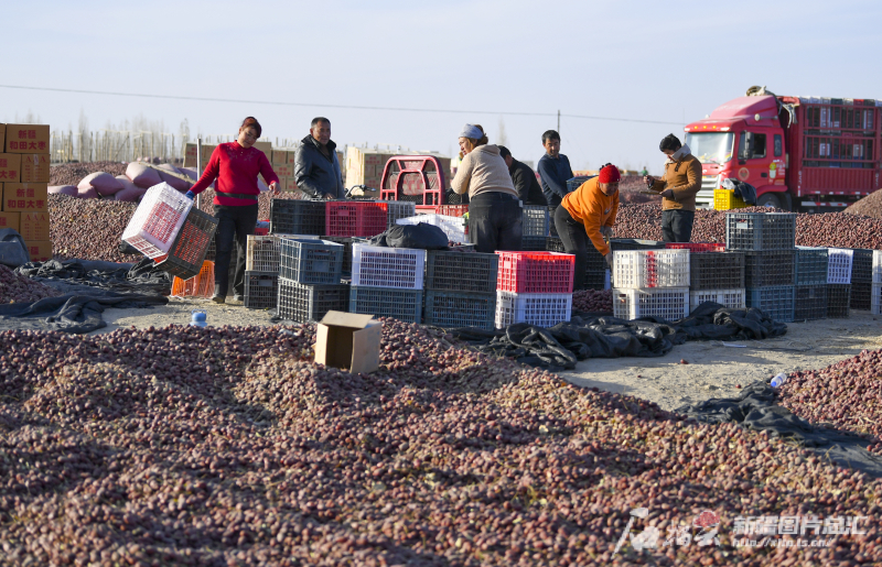 11月29日,策勒縣農(nong) 民在晾曬場搬運紅棗。