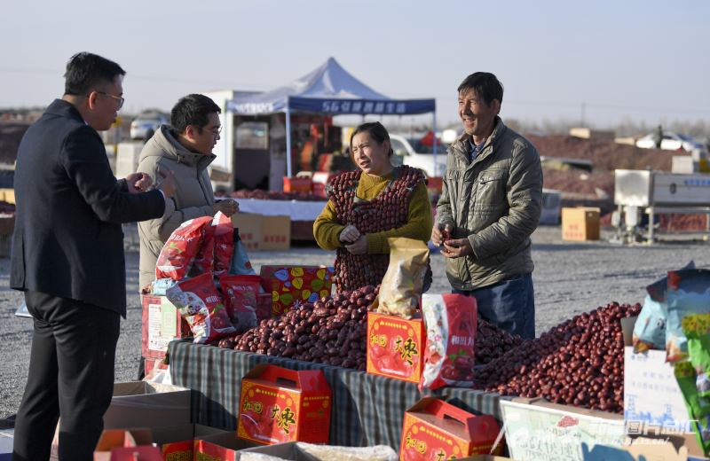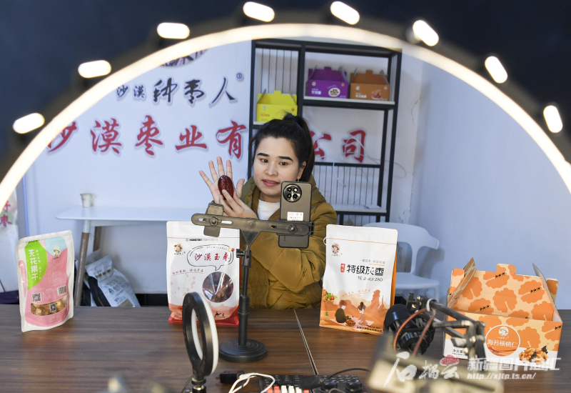 11月29日,策勒縣智慧果業(ye) 農(nong) 民專(zhuan) 業(ye) 合作社員工在直播銷售大棗。