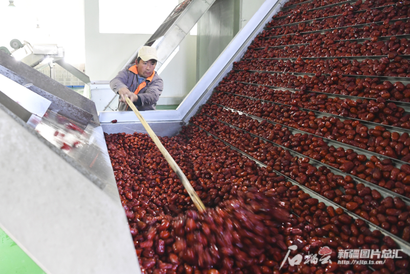 11月29日,策勒縣智慧果業(ye) 農(nong) 民專(zhuan) 業(ye) 合作社員工在查看紅棗烘幹情況。