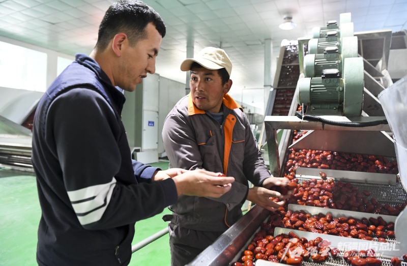 11月29日,策勒縣智慧果業(ye) 農(nong) 民專(zhuan) 業(ye) 合作社員工在烘幹車間作業(ye) 。