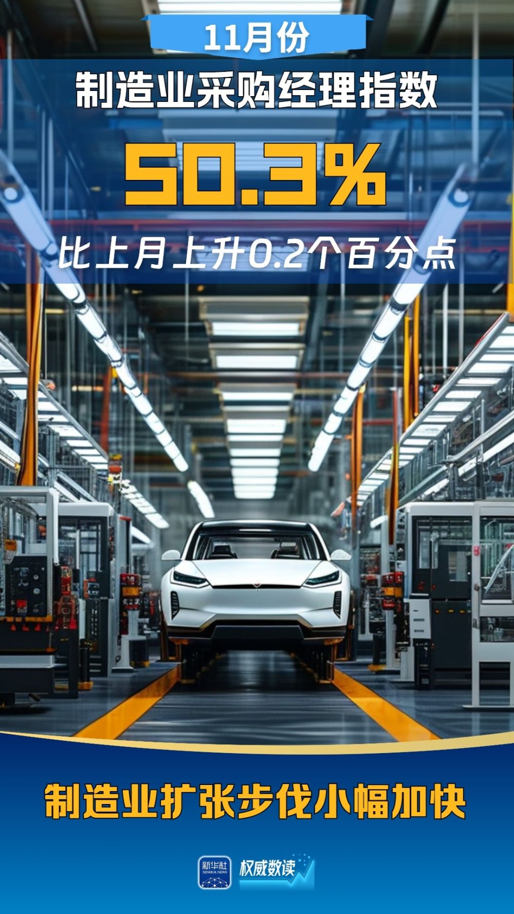 國家統計局30日發布中國采購經理指數。11月份,隨著一係列存量政策和增量政策持續協同發力,製造業(ye) PMI在景氣區間上行,升至50.3%,擴張步伐有所加快;非製造業(ye) 商務活動指數為(wei) 50.0%,比上月下降0.2個(ge) 百分點,位於(yu) 臨(lin) 界點;綜合PMI產(chan) 出指數為(wei) 50.8%,與(yu) 上月持平,表明我國企業(ye) 生產(chan) 經營活動總體(ti) 繼續擴張。