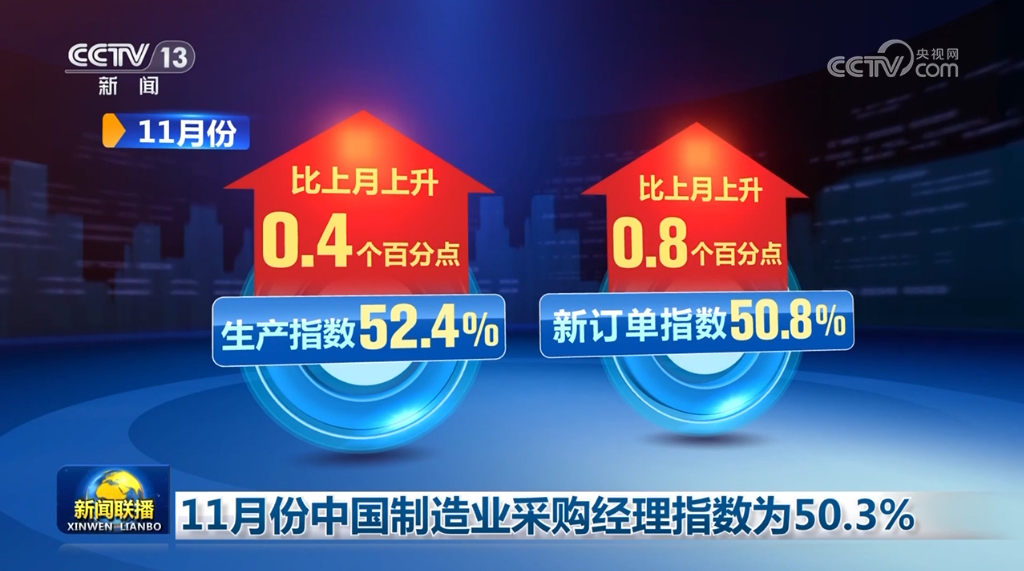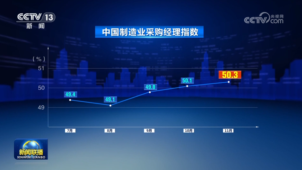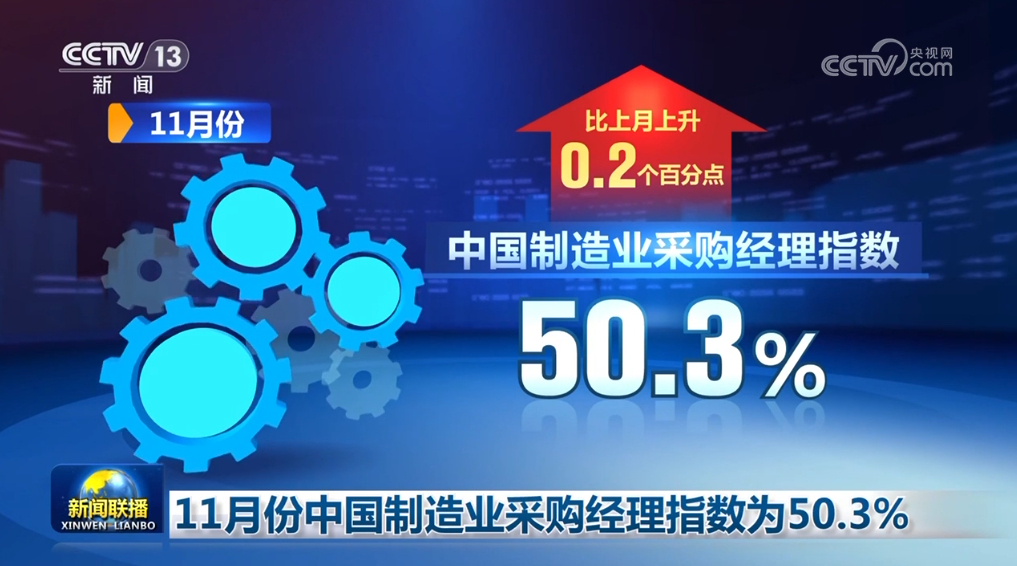 11月份中國製造業(ye) 采購經理指數為(wei) 50.3%,比上月上升0.2個(ge) 百分點。