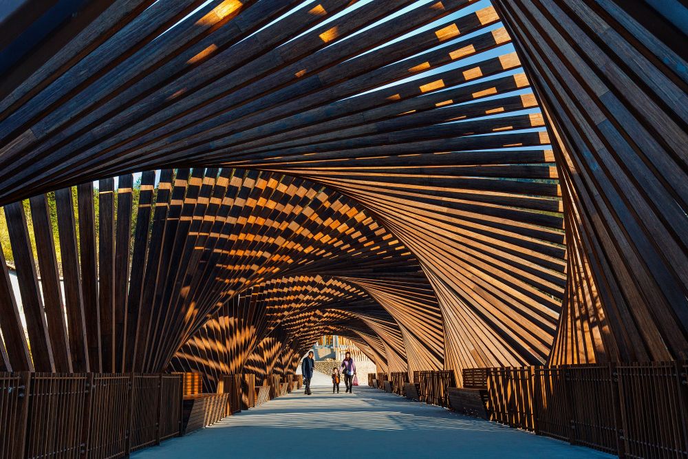 圖為(wei) 溪頭村國際竹建築村落16個(ge) 建築單體(ti) 之一“時光隧道橋”。新華社發