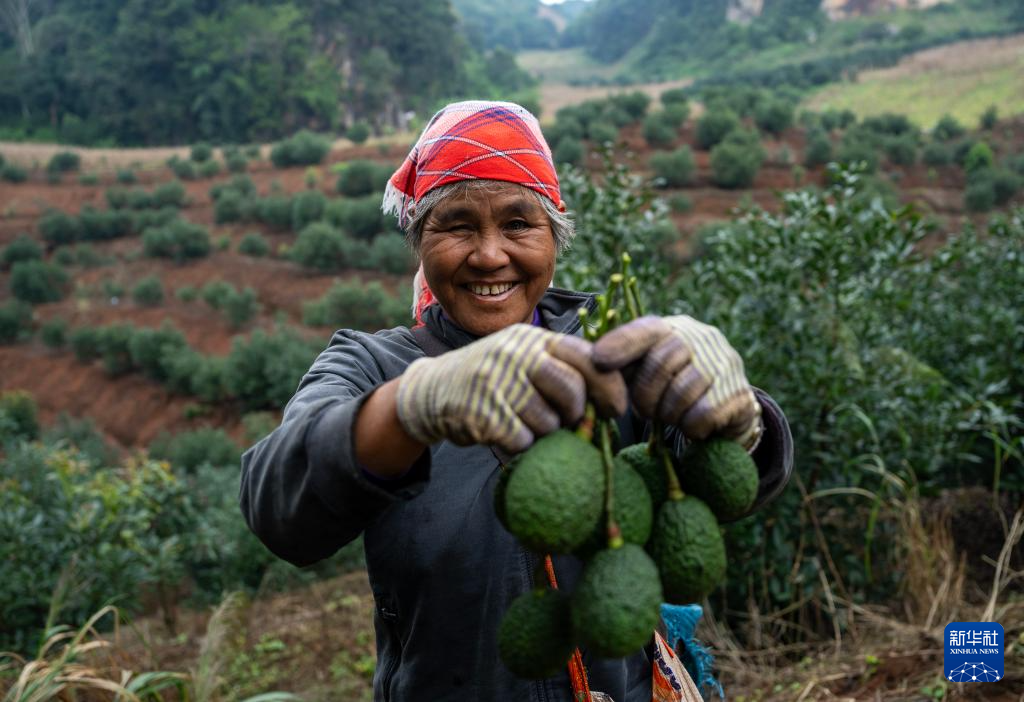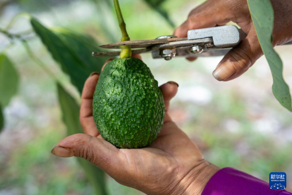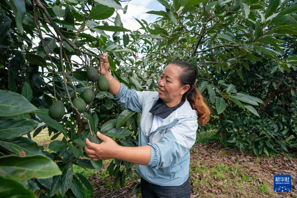 由企業(ye) 在當地農(nong) 民中培訓的產(chan) 業(ye) 技術人員李美瓊在一處牛油果種植基地檢查待采的牛油果(10月29日攝)。新華社記者 陳欣波 攝