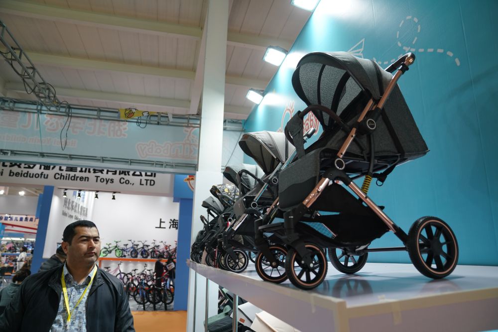 在河北省平鄉(xiang) 縣河古廟鎮一家童車生產(chan) 企業(ye) 展廳內(nei) 拍攝的童車產(chan) 品。新華社記者 嶽文婷 攝