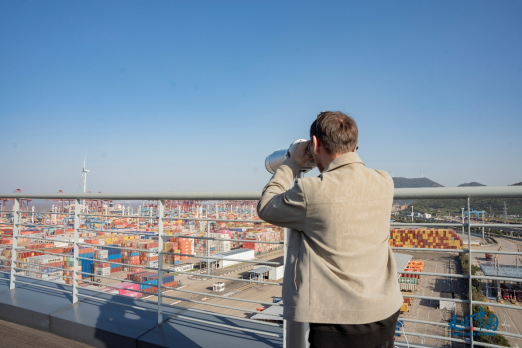 記者們(men) 站在觀景平台,通過望遠鏡親(qin) 眼見證了全球最繁忙集裝箱港口之一的現代化作業(ye) ,他們(men) 爭(zheng) 相與(yu) 壯觀的碼頭場景合影留念。來自哈薩克斯坦《誠實報》社會(hui) 文化部主任納烏(wu) 雷茲(zi) 別克·薩爾沙耶夫在接受環球網記者采訪時說道“寧波舟山港的運作效率和智能化管理令人讚歎,它無疑是全球物流行業(ye) 的標杆。”