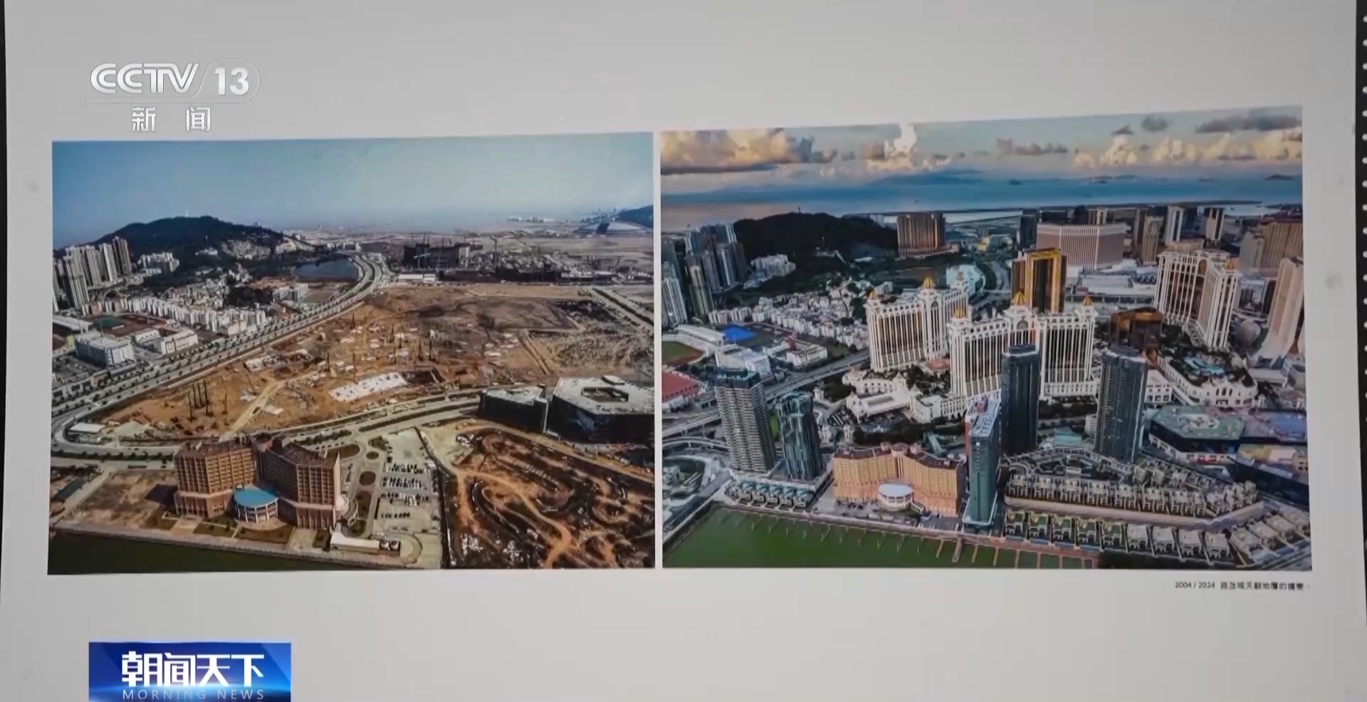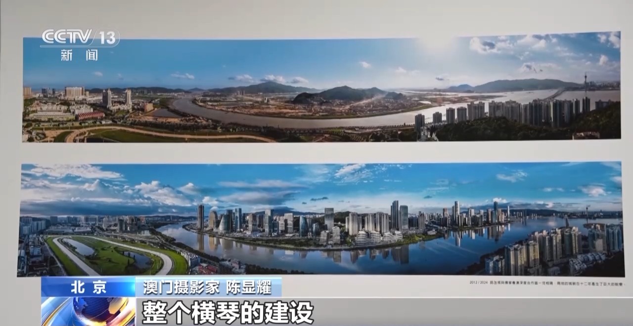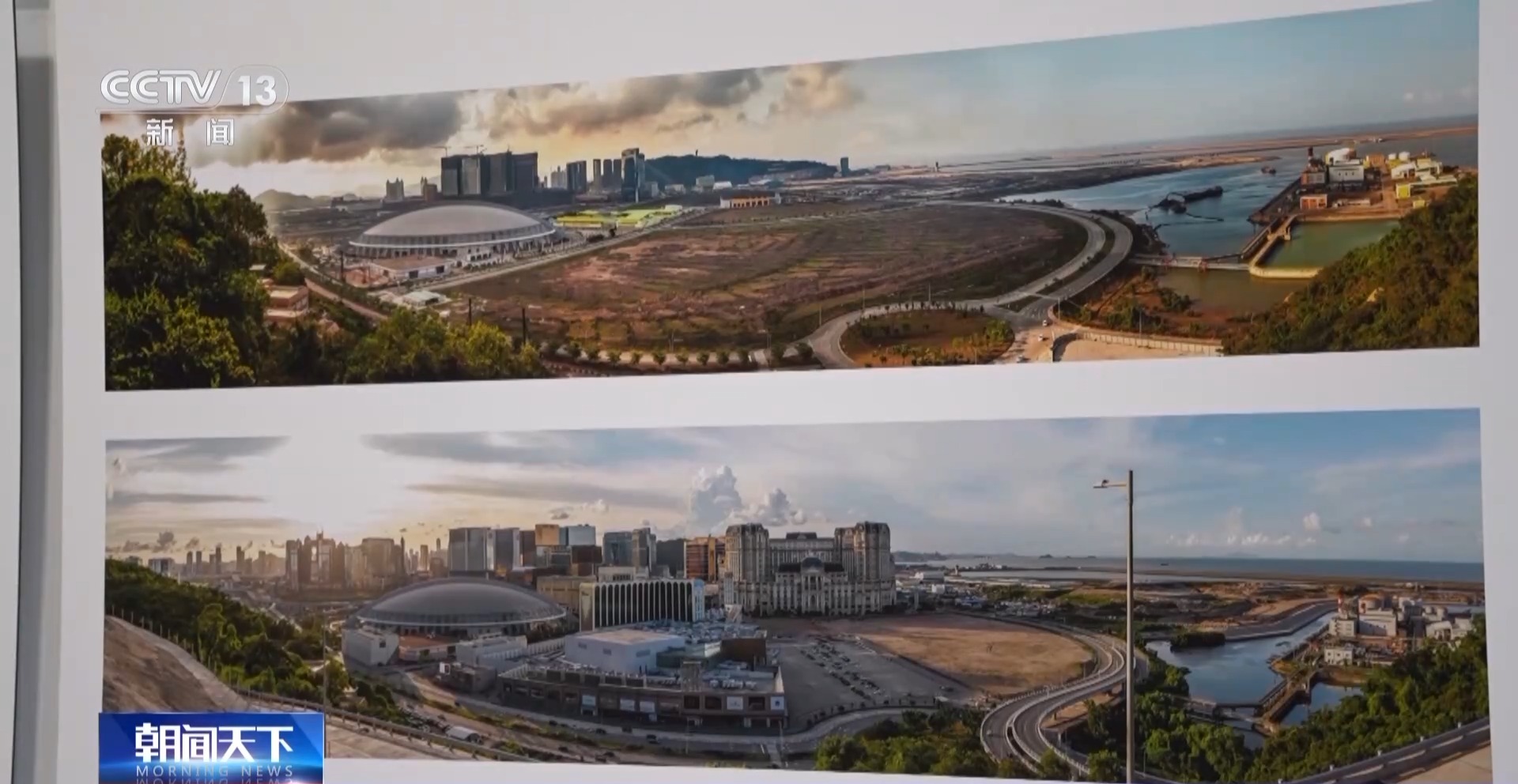 澳門攝影家 陳顯耀:回歸之後,隨著我們(men) 澳門的發展,也是帶動周邊區域一起發展繁榮。我們(men) 畫麵看到的是橫琴,上麵的照片是2012年的時候,橫琴都是山體(ti) ,在準備開發了。下麵是成立的橫琴粵澳深度合作區,整個(ge) 橫琴的建設也為(wei) 我們(men) 澳門的發展建設提供了一個(ge) 很重要的支撐、保障。