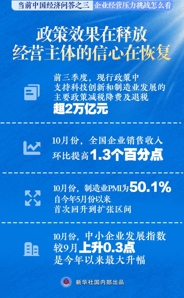 10月份,全國企業(ye) 銷售收入同比增長,環比提高1.3個(ge) 百分點;製造業(ye) PMI為(wei) 50.1%,自今年5月份以來首次回升到擴張區間;非製造業(ye) 商務活動指數連續數月穩定在50%左右;中小企業(ye) 發展指數較9月上升0.3點,是今年以來最大升幅。