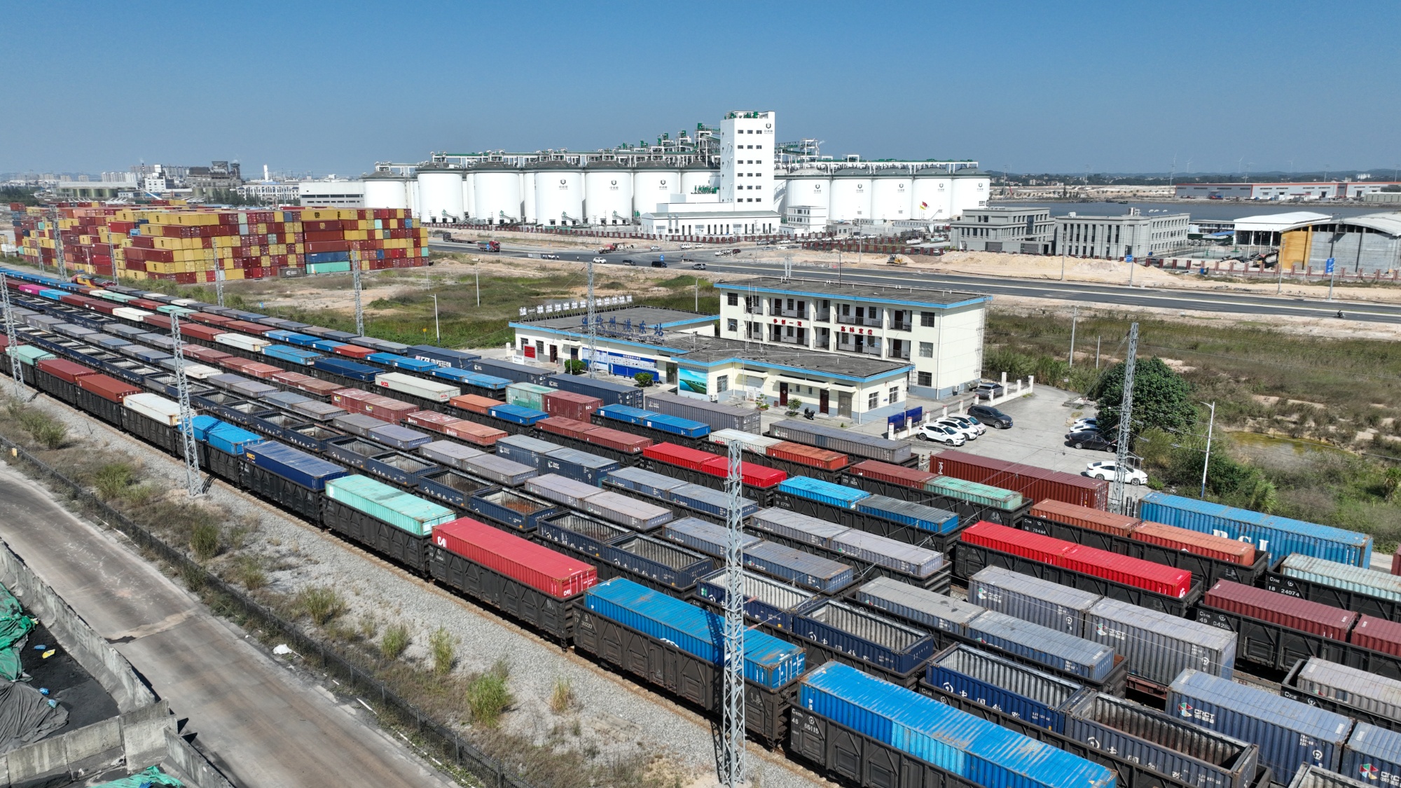 在欽州港東(dong) 站,一趟趟編好的鐵海聯運班列整齊地停在股道內(nei) (央廣網發 何家海 攝)