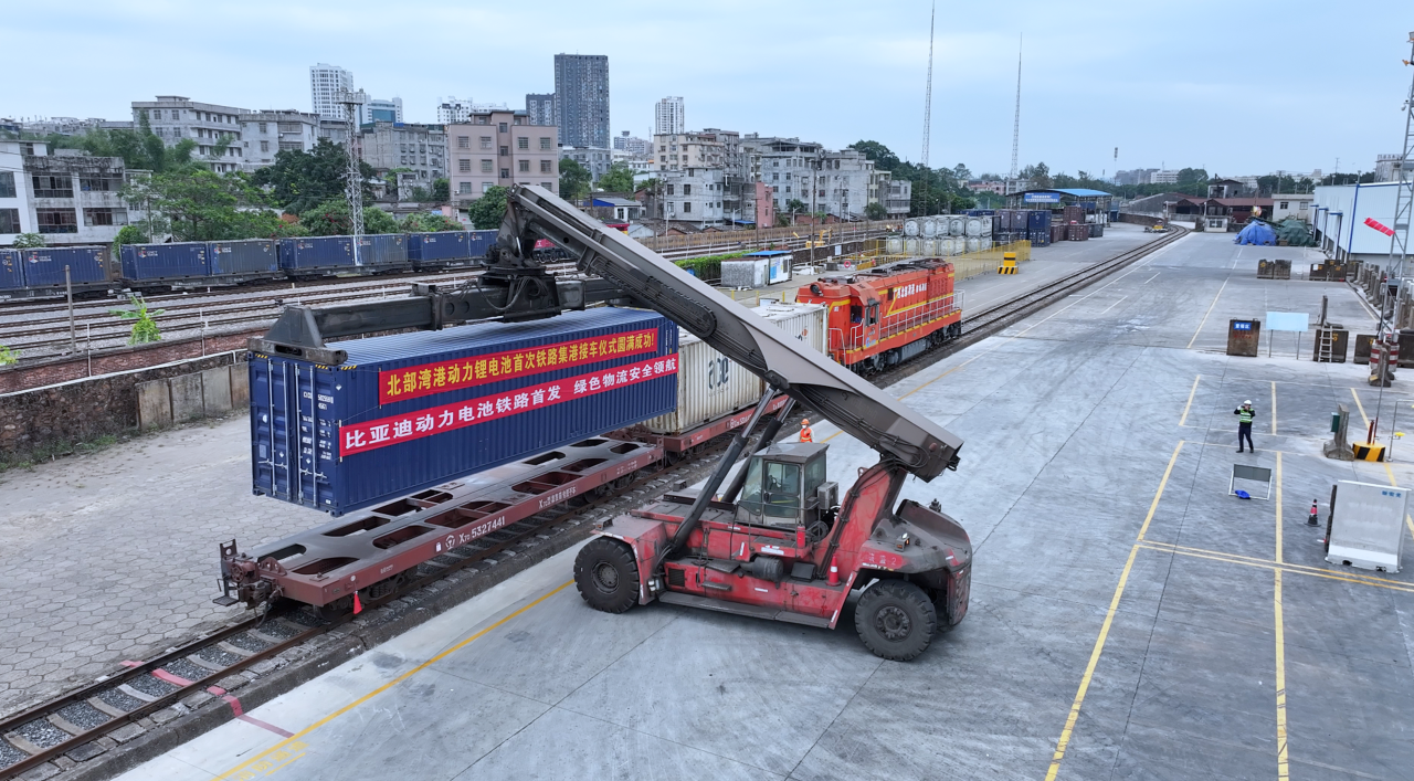 11月19日,一列載著比亞(ya) 迪新能源動力鋰電池的列車,從(cong) 重慶長壽區渝巴專(zhuan) 用鐵路發車,沿著西部陸海新通道南下,於(yu) 22日駛入廣西北部灣防城港新宏光鐵路專(zhuan) 用線。隨著接卡作業(ye) 的完成,全國首次鐵路發運動力鋰電池在北部灣港順利接卸。