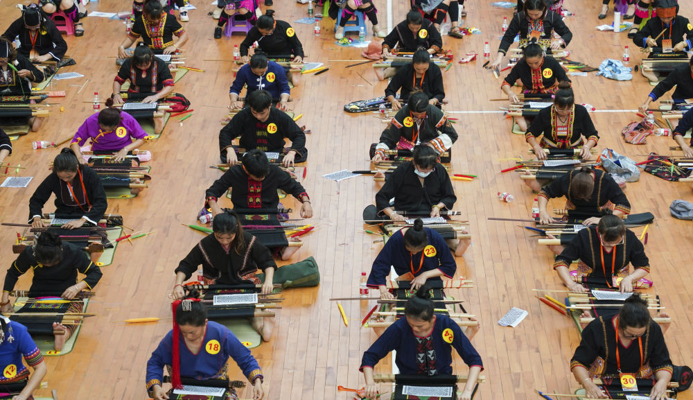 在海南省樂(le) 東(dong) 黎族自治縣,選手們(men) 在技藝比賽現場編織黎錦(2023年4月23日攝)。新華社記者 樊雨晴 攝