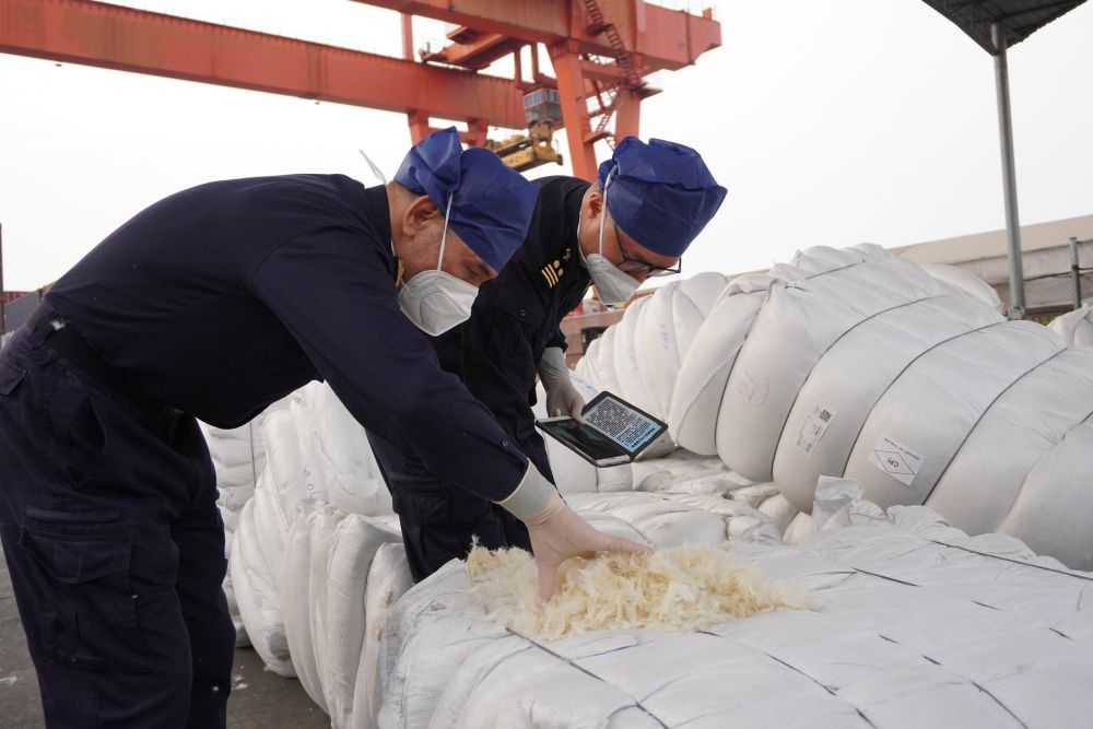 海關(guan) 工作人員正在對水洗羽毛羽絨進行檢查。新華社發