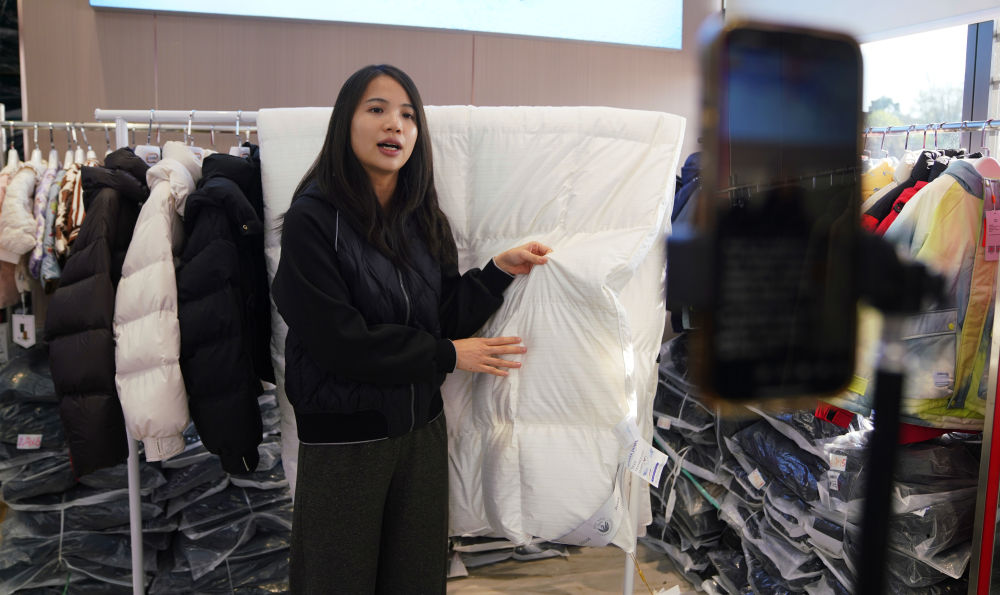 在橋圩羽絨產(chan) 業(ye) 園展示廳,銷售人員正在直播介紹當地生產(chan) 的羽絨被。新華社記者 楊馳 攝
