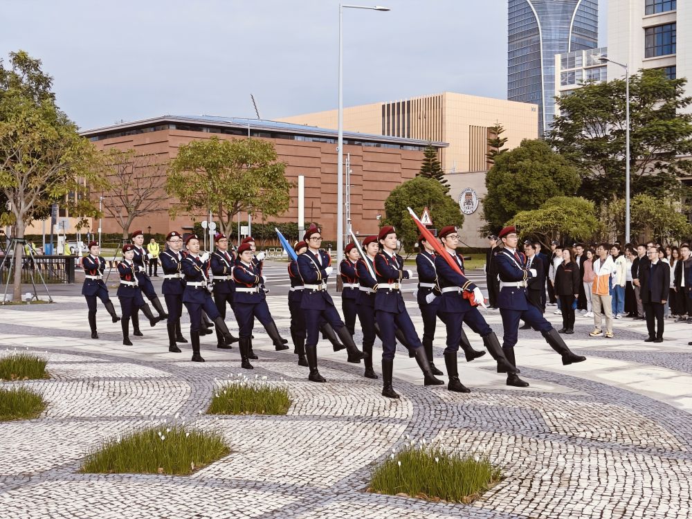 “正步走!”早晨八點,曙光照拂澳大蓮花廣場,身著海軍(jun) 藍製服的學生邁著鏗鏘有力的步伐走向升旗台。國歌響起,五星紅旗在澳門特區區旗和澳門大學校旗映襯下,冉冉升起,迎風招展。