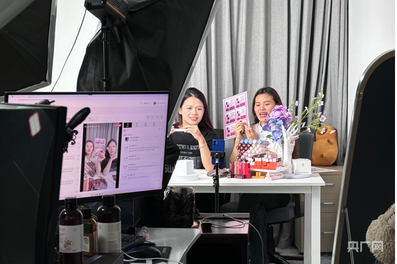 留學生正在基地直播(央廣網記者 楊贇 攝)