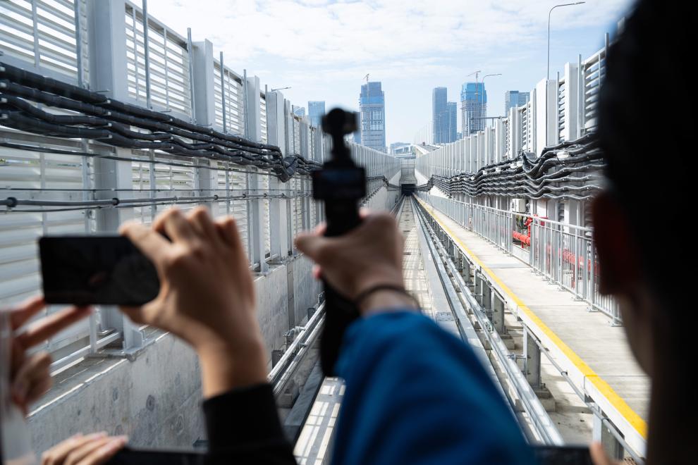 乘客乘坐澳門輕軌首班車前往橫琴站(2024年12月2日攝)。新華社發 (張金加攝)