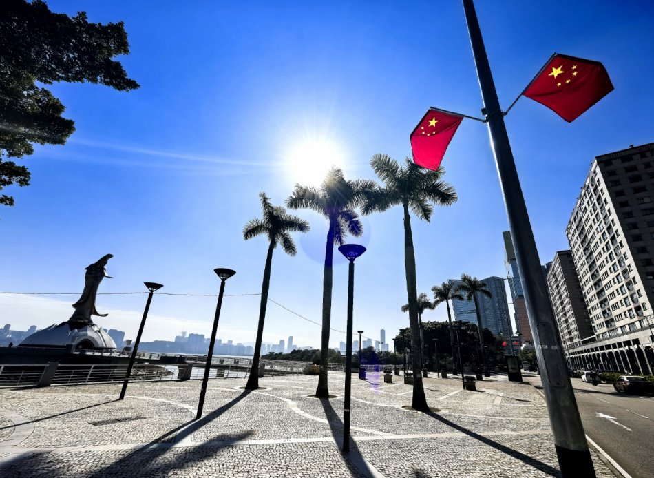 12月18日,澳門街頭隨處可見慶祝澳門回歸祖國25周年的元素,國旗及特區區旗隨風飄揚。(海外網 牛寧 攝)