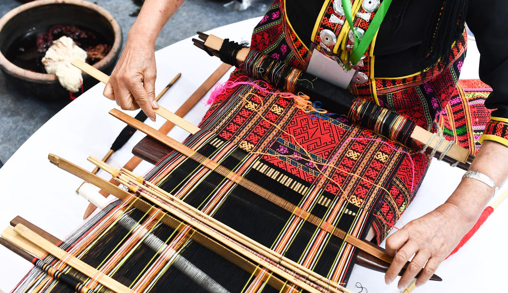 在2023海南錦繡世界文化周非物質文化遺產(chan) 傳(chuan) 統織繡印染技藝項目精品展上,手工藝人在編織黎錦(2023年4月30日攝)。新華社記者 楊冠宇 攝