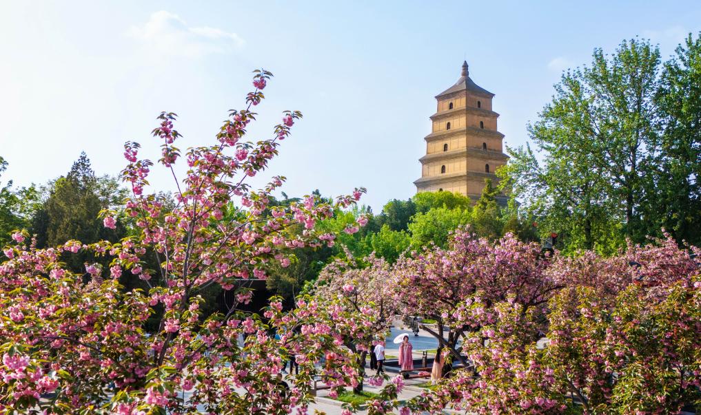 遊客在西安大雁塔下遊覽(無人機照片,2024年4月10日攝)。 新華社記者 鄒競一 攝