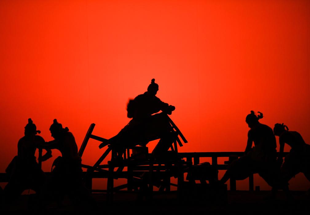這是以“雲(yun) 夢睡虎地黑夫木牘”為(wei) 靈感創排的大型曆史舞台劇《赳赳大秦》演出現場(2024年9月25日攝)。 新華社記者 張博文 攝