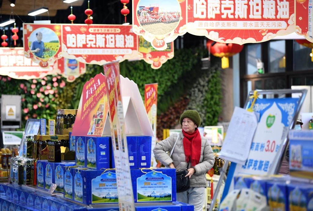 消費者在“中歐班列(西安)進口商品年貨節”上挑選哈薩克斯坦糧油產(chan) 品(2024年2月1日攝)。 新華社記者 李一博 攝