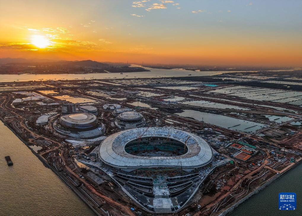 位於(yu) 粵港澳大灣區“地理幾何中心”的廣州南沙全民文化體(ti) 育綜合體(ti) 建設進展順利(2024年11月27日攝,無人機照片)。