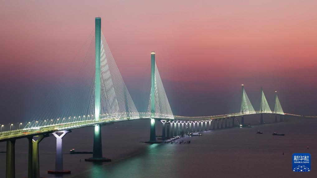 暮色中的黃茅海跨海通道高欄港大橋(左側(ce) 雙主塔)和黃茅海大橋(右側(ce) 三主塔)(2024年12月7日攝,無人機照片)。