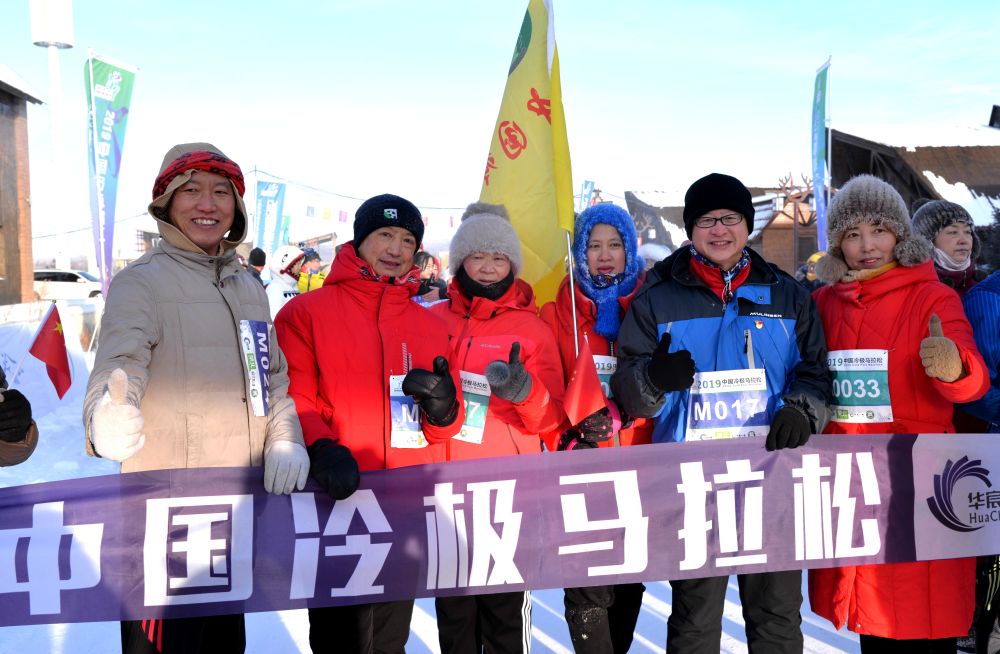 資料圖:2019年12月25日,參賽選手在冷極馬拉鬆開跑前合影留念。新華社記者 徐欽 攝