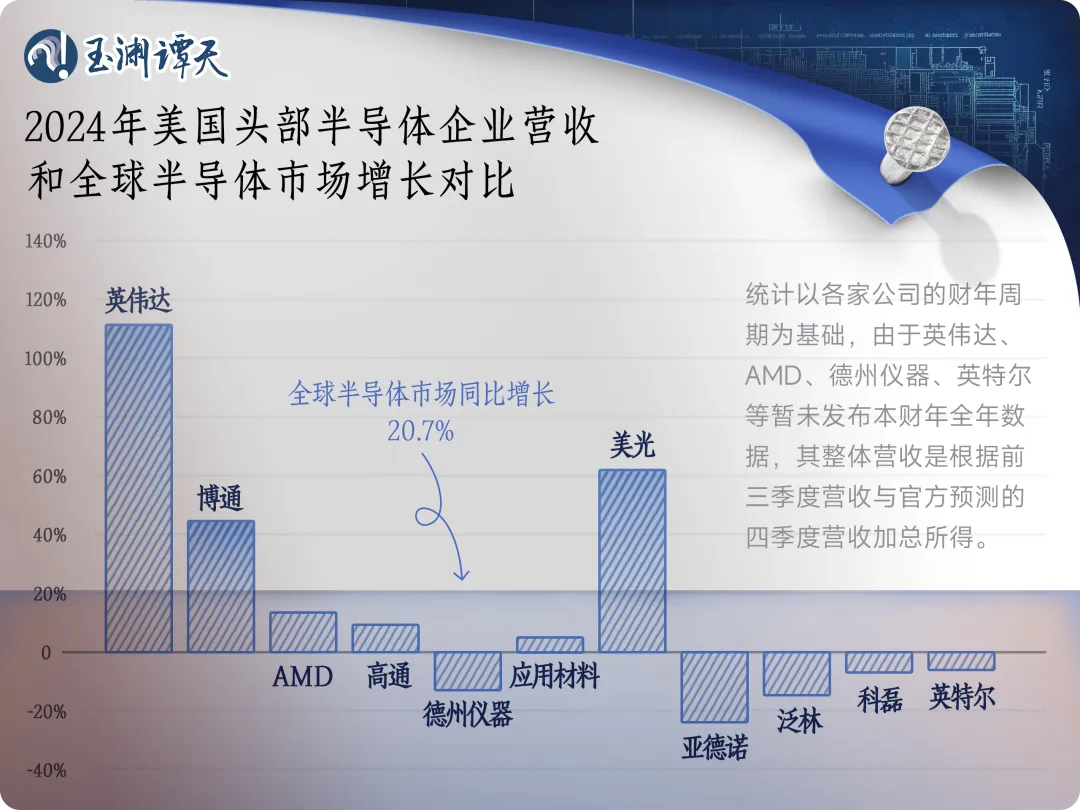 2024年,全球芯片市場都在回暖,預計同比增長20.7%。與(yu) 此同時,英偉(wei) 達2024年營收預計同比增長超100%,成為(wei) 美國芯片市場增長最大的動力。