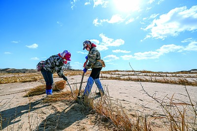 內(nei) 蒙古科爾沁沙地,治沙工人在打草方格。