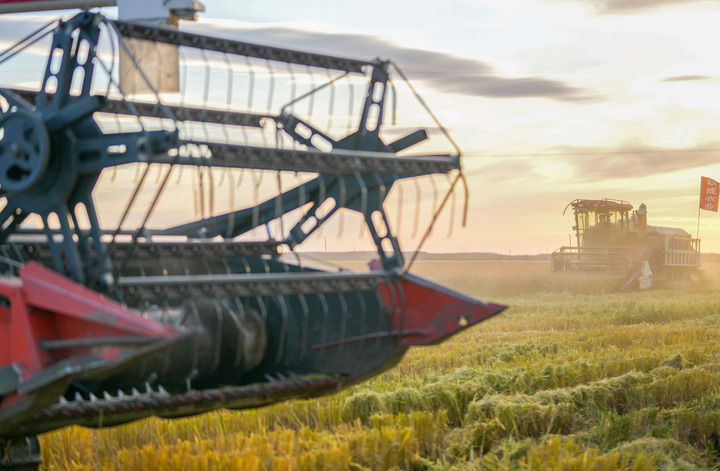 2024年9月22日,農(nong) 業(ye) 機械在黑龍江省哈爾濱市方正縣的稻田中進行收獲作業(ye) 。新華社記者 王鬆 攝