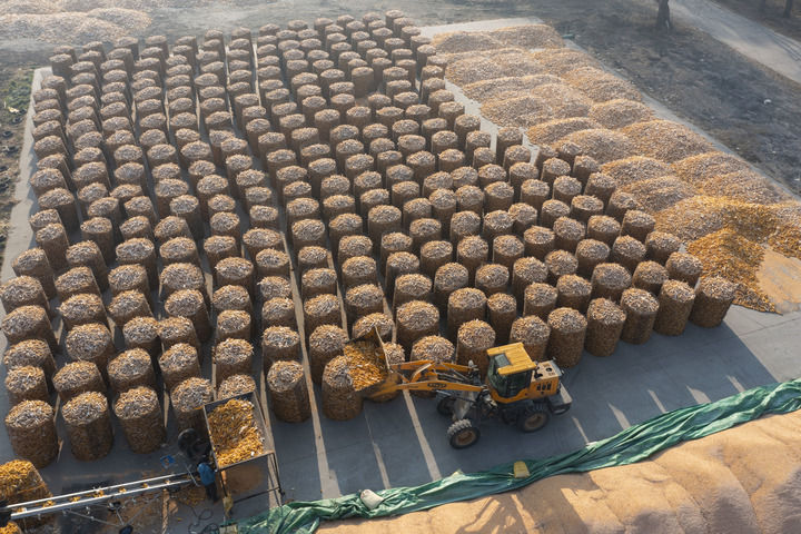 2024年11月13日,在黑龍江省肇東(dong) 市一處秋糧晾曬場,海城雙麗(li) 現代農(nong) 機專(zhuan) 業(ye) 合作社的農(nong) 民駕駛農(nong) 機堆放玉米(無人機照片)。新華社記者 謝劍飛 攝