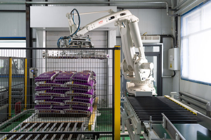 2024年3月29日,黑龍江省黑河市五大連池市一家農(nong) 業(ye) 科技企業(ye) 的機械臂在車間內(nei) 碼放包裝好的大豆種子。新華社記者 謝劍飛 攝