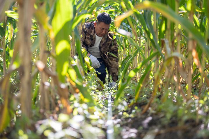 2024年9月24日,黑龍江省寶清縣農(nong) 業(ye) 技術推廣中心的農(nong) 藝師在寶清縣青原鎮一片玉米地中測產(chan) 。新華社記者 謝劍飛 攝
