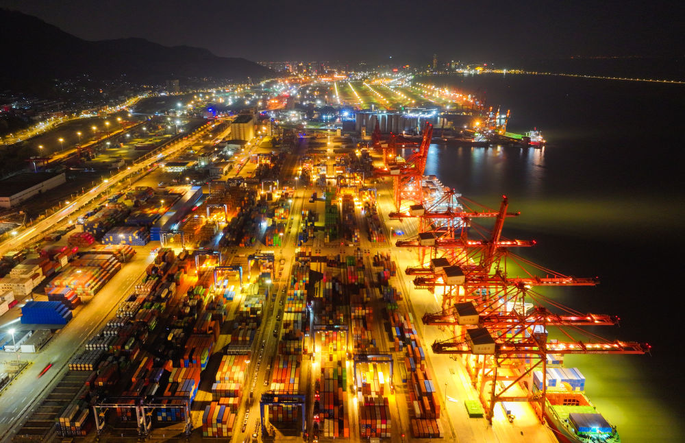 當日,夜幕下的江蘇連雲(yun) 港港集裝箱碼頭燈火明亮,工作人員繁忙有序地進行裝卸工作。臨(lin) 近年末,江蘇連雲(yun) 港港持續提升港口集疏運水平,多措並舉(ju) 加快貨物裝卸轉運效率,力爭(zheng) 外貿集裝箱吞吐量與(yu) 出口量再創新高。