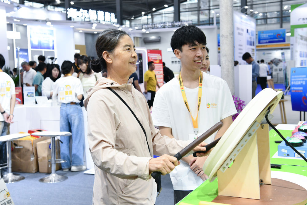 10月27日,老人在2024深圳國際智慧養(yang) 老產(chan) 業(ye) 博覽會(hui) 上體(ti) 驗樂(le) 齡鼓。(新華社記者 梁旭 攝)