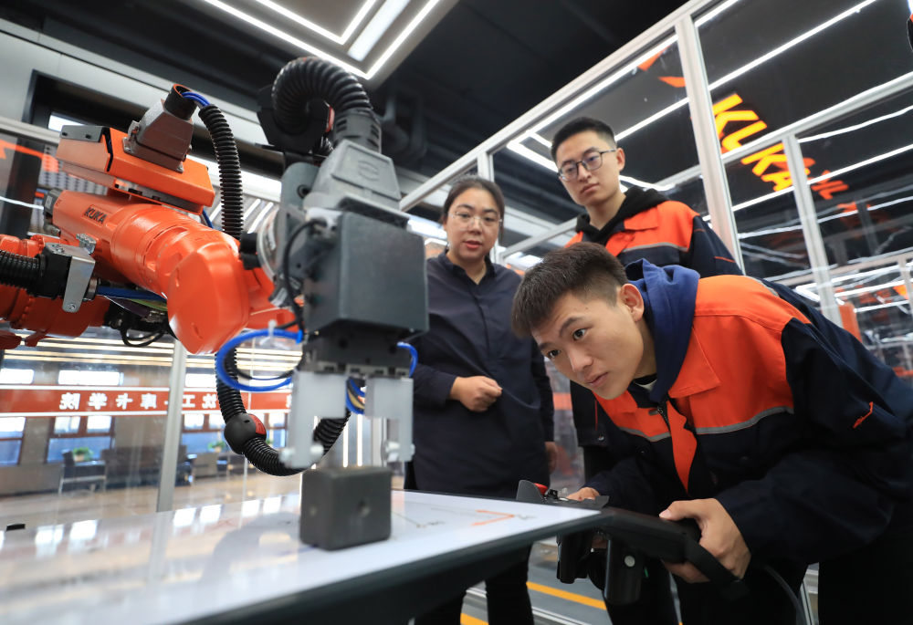 產(chan) 教融合促就業(ye) 。11月22日,沈陽工學院電氣工程及自動化專(zhuan) 業(ye) 學生操作機器人進行物料碼垛實訓。(新華社記者楊青攝)