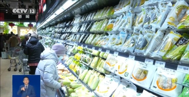 記者在北京一家生鮮超市裏看到,新年主題的裝飾品擺放在顯著位置,年貨禮盒琳琅滿目。新鮮到店的蔬菜、鮮果、肉類等商品排滿了貨架,吸引了大批顧客選購。