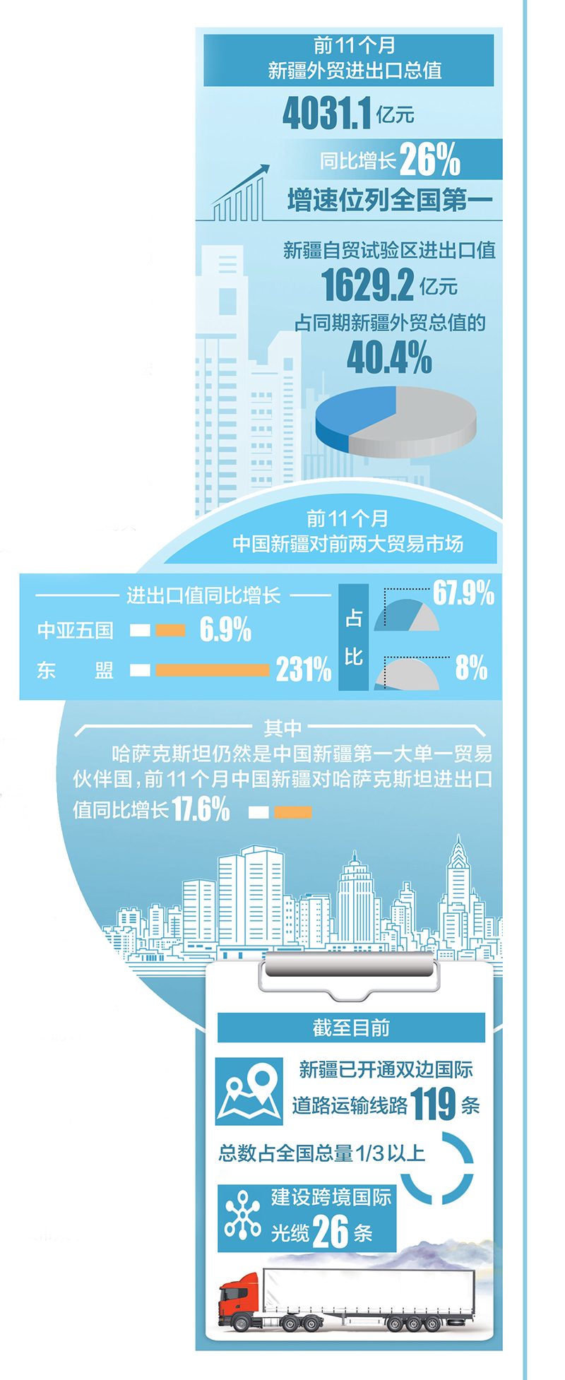 新疆自貿試驗區賦能效應持續顯現。烏(wu) 魯木齊海關(guan) 數據顯示,前11個(ge) 月,新疆自貿試驗區進出口值1629.2億(yi) 元,占同期新疆外貿總值的40.4%。