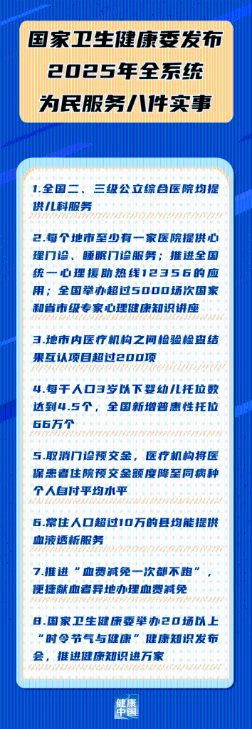 國家衛生健康委31日發布2025年全係統為(wei) 民服務八件實事,包括: