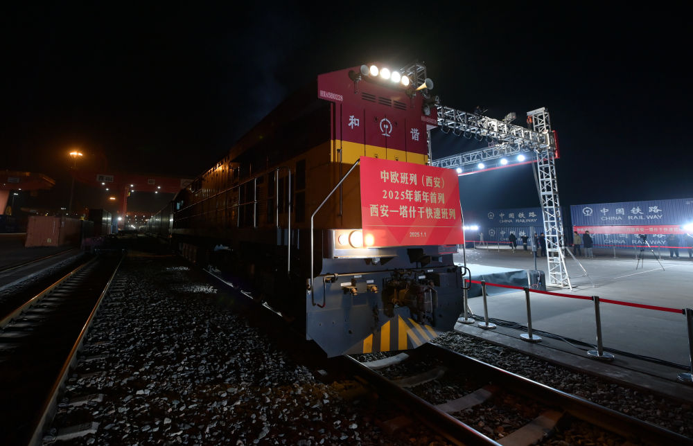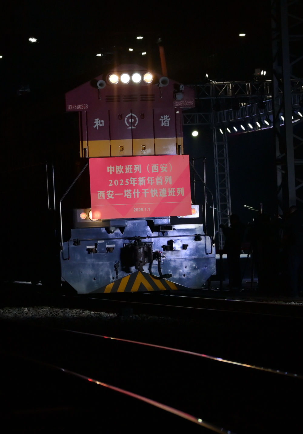 2025年1月1日0時,伴隨著汽笛長鳴,滿載著白色家電、紡織品和化工品等貨物共計50個(ge) 集裝箱的中歐班列(西安)駛出西安國際港站,一路向西駛往烏(wu) 茲(zi) 別克斯坦首都塔什幹。