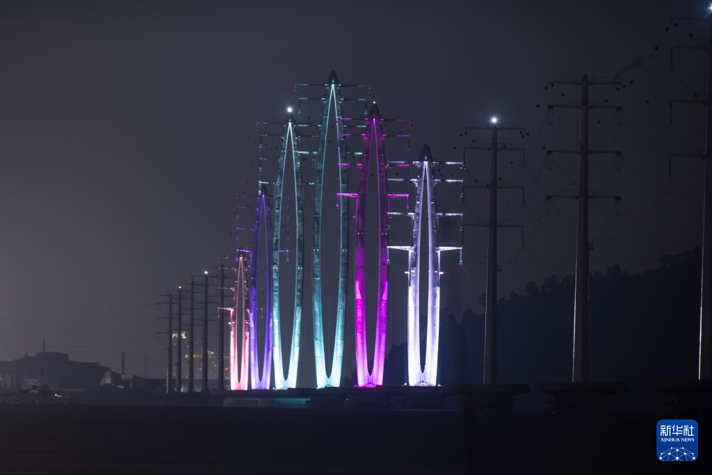 2024年12月31日午夜,屹立在馬來西亞(ya) 檳城州檳島東(dong) 側(ce) 檳威海峽中央的六座輸電杆塔依次點亮景觀燈,與(yu) 岸邊的民眾(zhong) 共同迎接2025年的到來。