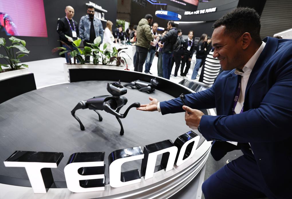 2024年2月26日,在西班牙巴塞羅那舉(ju) 行的2024年世界移動通信大會(hui) 上,人們(men) 參觀傳(chuan) 音旗下的TECNO展台。新華社記者高靜攝