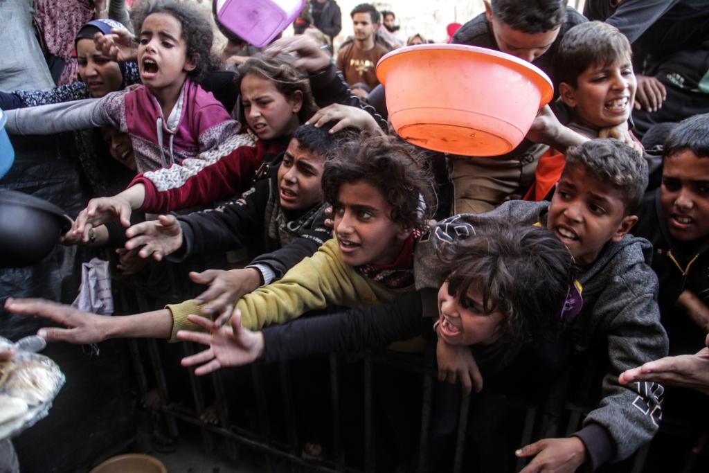 2024年12月23日,巴勒斯坦兒(er) 童在加沙城領取食物。新華社發(馬哈茂德·紮基攝)
