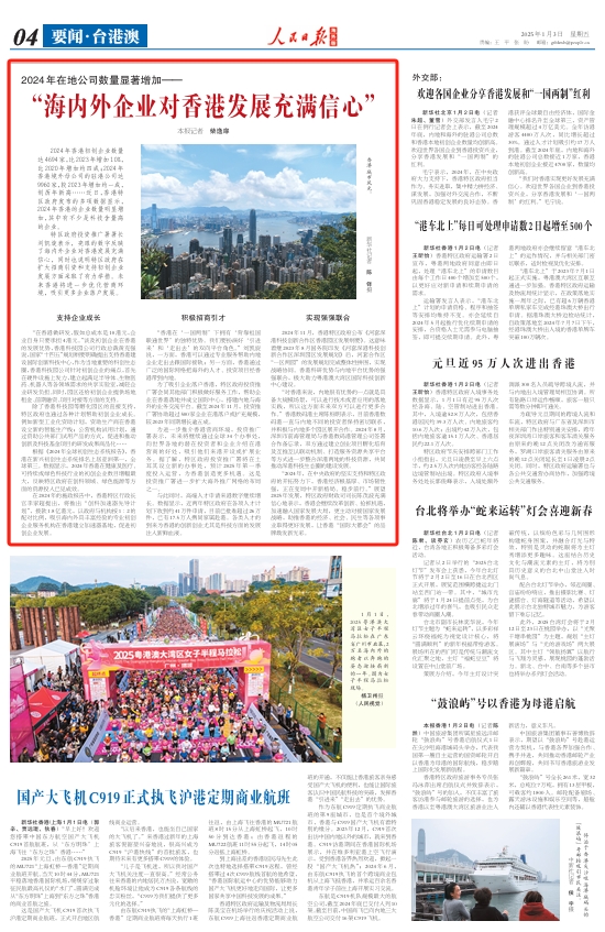 “2024年,在中央政府的堅實支持和特區政府的開拓努力下,香港經濟根基厚、市場韌性強,正在變局中開新格局、穩步前行。”展望2025年發展,特區政府財政司司長陳茂波充滿信心地表示,香港會(hui) 繼續改革創新、搶抓機遇,加速融入國家發展大局,更主動對接國家發展戰略,助推香港的經濟、社會(hui) 、民生等各項事業(ye) 取得更好發展,讓香港“國際大都會(hui) ”的品牌煥發新光彩。