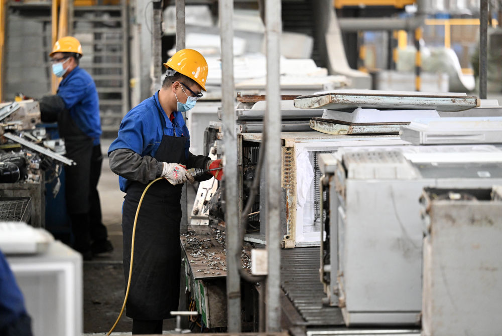 天津一家家電拆解企業(ye) 的工作人員在冰箱拆解線拆解廢舊冰箱。新華社記者趙子碩 攝