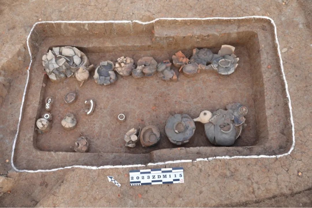2023年以來,省文物考古研究院圍繞明晰遺址內(nei) 部布局和確認遺址宏觀結構兩(liang) 個(ge) 方麵,再次開展對東(dong) 山村遺址的主動性考古發掘。截至目前,共發掘新石器時代大型紅燒土堆積4處、墓葬17座、房址1座、灰坑20座、灰溝1條、水井1口、柱洞3個(ge) 。