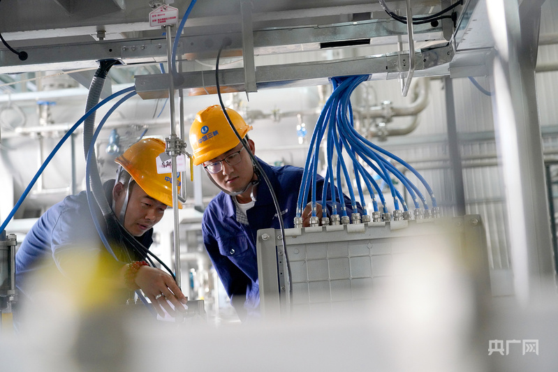 內(nei) 蒙古鄂爾多斯,工人利用光伏發出的綠電製取綠氫
