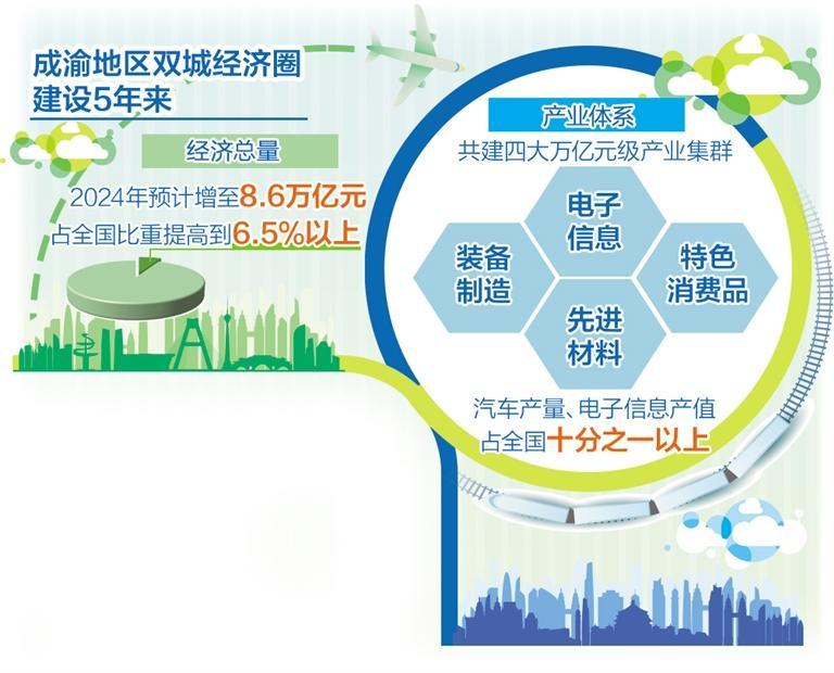 一是具有全國影響力的重要經濟中心建設實現新躍升。經濟總量上,雙城經濟圈地區生產(chan) 總值5年邁上了兩(liang) 個(ge) 萬(wan) 億(yi) 元級台階,2024年預計增至8.6萬(wan) 億(yi) 元,占全國的比重由6.3%提高到6.5%以上;產(chan) 業(ye) 體(ti) 係上,兩(liang) 地共建電子信息、裝備製造、先進材料、特色消費品四大萬(wan) 億(yi) 元級的產(chan) 業(ye) 集群,汽車產(chan) 量、電子信息產(chan) 值占全國十分之一以上。